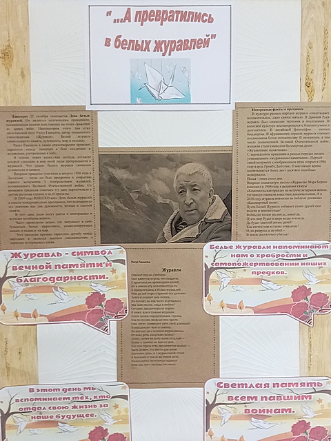 Ежегодно 22 октября отмечается Всемирный день белых журавлей. Он является поэтическим праздником, посвященным памяти всех павших на полях сражений во время войн. Инициатором этого дня стал дагестанский поэт Расул Гамзатов, автор знаменитого стихотворения «Журавли». Белый журавль символизирует память, духовность, мир и надежду. В основе лежит кавказская легенда, согласно которой ушедшие в мир иной люди превращаются в журавлей. В 1965 году Расул Гамзатов побывал у памятника японской девочке Садако Сасаки в Хиросиме. В руках девочка держит бумажного журавлика, у подножия памятника было также множество бумажных журавликов. Садако Сасаки родилась 7 января 1943 года. Ей было 2 года, когда на Хиросиму была сброшена атомная бомба. В 1954 году девочке было 11 лет, когда врачи поставили страшный диагноз-лейкемия. Девочке оставалось жить меньше года.