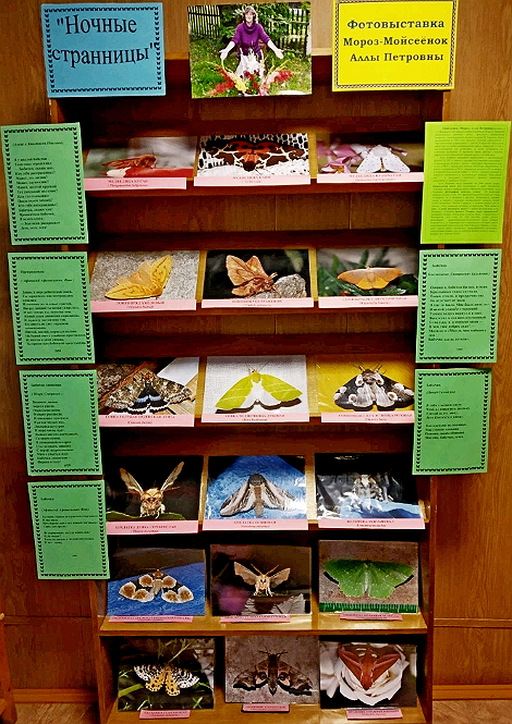 В Воропаевской горпоселковой библиотеке в рамках проекта «Творцы зямлi варапаеўскай» начала работать новая фотовыставка Мойсеёнок (Мороз) Аллы Петровны «Ночные странницы», посвященная Всемирному дню бабочек.