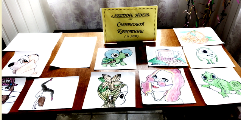 Весь июль в библиотеке работает салон «Арт-каникулы», в котором были представлены две коллекции: выставка работ алмазной вышивки «Чудо ручки – чудо штучки» Пашковой Элины (7 лет) и выставка рисунков «Летние идеи» Смирновой Кристины (11 лет).