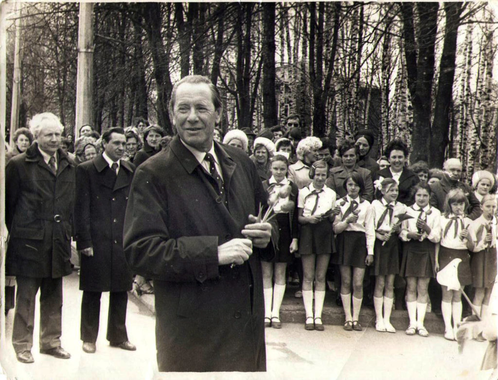 Петр МАШЕРОВ возлагает цветы к мемориальному комплексу в Россонах, 1978 год.