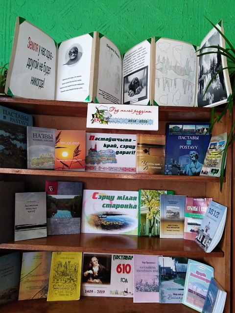 На выставе прадстаўлены тры кнігі з назвай “Паставы” з рознымі прыгожымі і цікавымі малюнкамі і фотаздымкамі, якія расказваюць пра прыгажосць нашага краю.