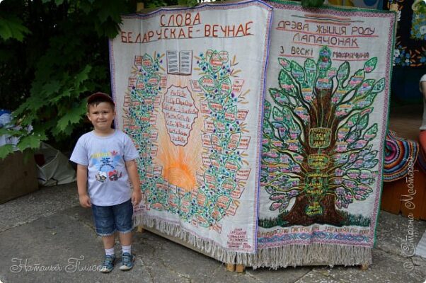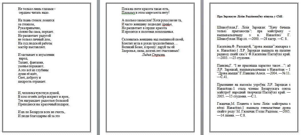 На красочном панно в окаймлении из васильков и колосьев вышиты листочки с фамилиями и названиями произведений 36 белорусских просветителей и писателей. Первоначально Лилия Родионовна хотела увековечить на панно фамилии 150 деятелей культуры, но решила остановиться только на самых выдающихся личностях – от Евфросинии Полоцкой и Франциска Скорины до Ивана Шамякина и Андрея Макаенка. На подготовку панно, посвященного Дню белорусской письменности, у Лилии Зарецкой ушло два месяца.