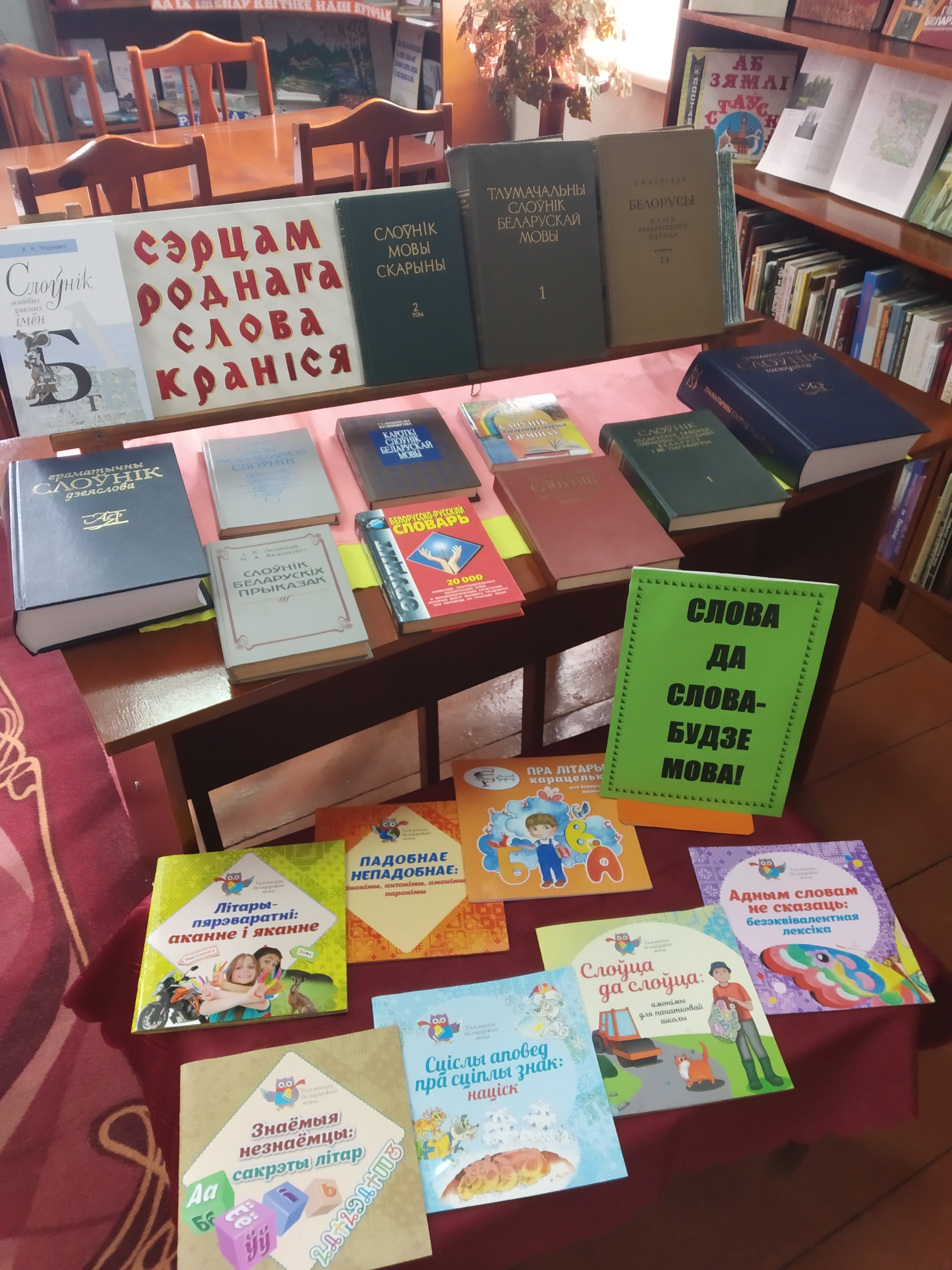 У дапамогу чытачам была прадстаўлена кніжная выстава слоўнікаў “Сэрцам роднага слова краніся”, на якой размясціліся самыя разнастайныя дапаможнікі: ад выдання 1956 года Е.Ф.Карскага “Белорусы. Исторический очерк словообразования и словоизменения в белорусском языке” выдаведства Акадэміі навук СССР, да яркіх і пазнавальных кніг для дзяцей малодшага школьнага ўзросту з серыі “Таямніцы беларускай мовы” выдавецтва “Беларуская Энцыклапедыя імя Петруся Броўкі” 2020 года выдання.
