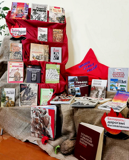 В читальном зале Поставской детской библиотеки им. В. Дубовки первоклассники познакомились с патриотической витриной «Чалавек. Вайна. Подзвіг». В представленных книгах ребята могут прочитать историю о солдате Иване и Фрице-Рыжем лисе, узнать какое «главное войско» было на той войне, вспомнить имена пионеров-героев.