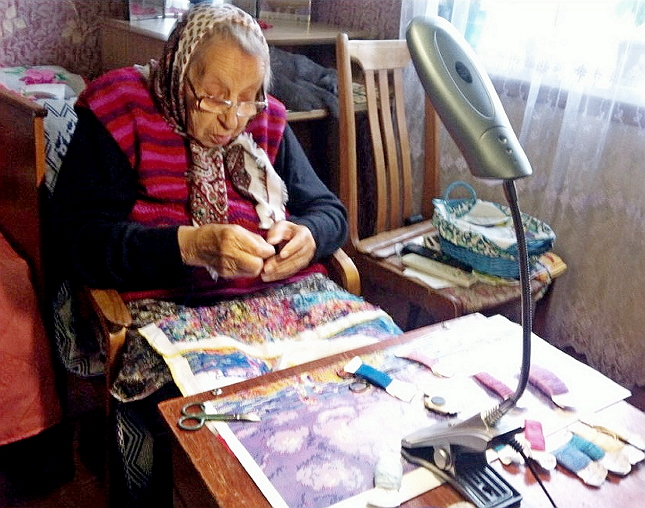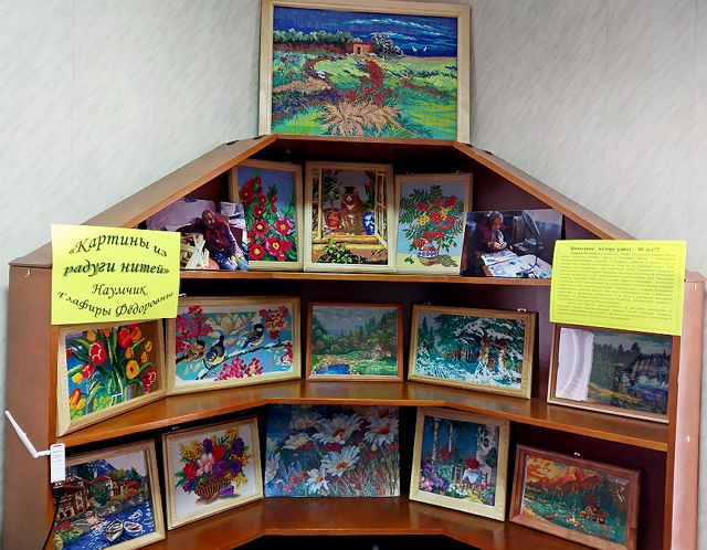 Справа ў тым, што аўтару работ 90 год і амаль усе карціны вышыты за апошні час. Ні адзін фотаздымак не можа перадаць фарбы і фактуру вышыўкі, якія прыцягваюць і заварожваюць позірк, выклікаюць жывую цікавасць і дораць сапраўдную эстэтычную асалоду ўсім наведвальнікам бібліятэкі. Схемы для сваіх работ Глафіра Фёдараўна бярэ з часопісаў і кніг, на падбор каляровай гамы затрачваецца амаль што цэлы дзень, а вышыўка самой карціны ў сярэднім займае месяц.