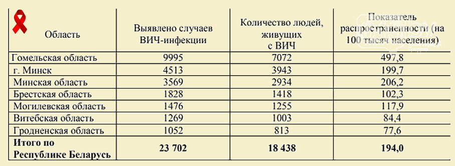 По состоянию на 1 сентября 2017 года в Республике Беларусь было зарегистрировано 23 702 случая ВИЧ-инфекции. Среди них 18 438 человек, живут с ВИЧ. Наиболее остро проблема ВИЧ-инфекции стоит в Гомельской и Минской области. Меньше всего случаев выявлено в Гродненской области.